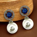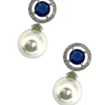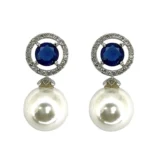 The Blue Sapphire and Pearl Drop Earrings feature a stunning combination of elegance and sophistication. At the heart of each earring is a rich, deep blue sapphire, encircled by a shimmering halo of brilliant-cut diamonds that enhance its captivating sparkle. Below the sapphire, a lustrous, creamy pearl drop adds a touch of classic grace. The delicate contrast between the vibrant blue sapphire, radiant diamonds, and soft pearls makes these earrings a timeless accessory, perfect for adding luxury to any formal or evening ensemble.