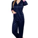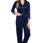 Tiya Women’s Satin Plain/Solid Top and Pyjama Set (Navy Blue)
