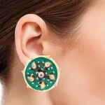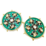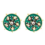 These exquisite gold-plated stud earrings showcase a harmonious blend of traditional artistry and contemporary elegance. Crafted with precision, the round design features a captivating green Meenakari enamel, skillfully applied to create intricate patterns that add a touch of cultural richness. The vibrant green hue serves as a striking backdrop for the delicate arrangement of white beads and Kundans, forming a captivating contrast that accentuates the overall allure.