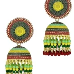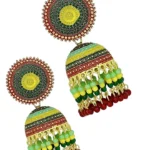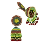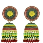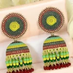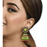 These vibrant jhumka earrings feature an intricate circular design adorned with multicolored beads, adding a playful touch to the traditional style. Hanging below is a classic dome-shaped jhumka embellished with additional colorful beads that sway gracefully with movement. The blend of bright hues and intricate craftsmanship makes these earrings perfect for adding a pop of color to both ethnic and fusion outfits.